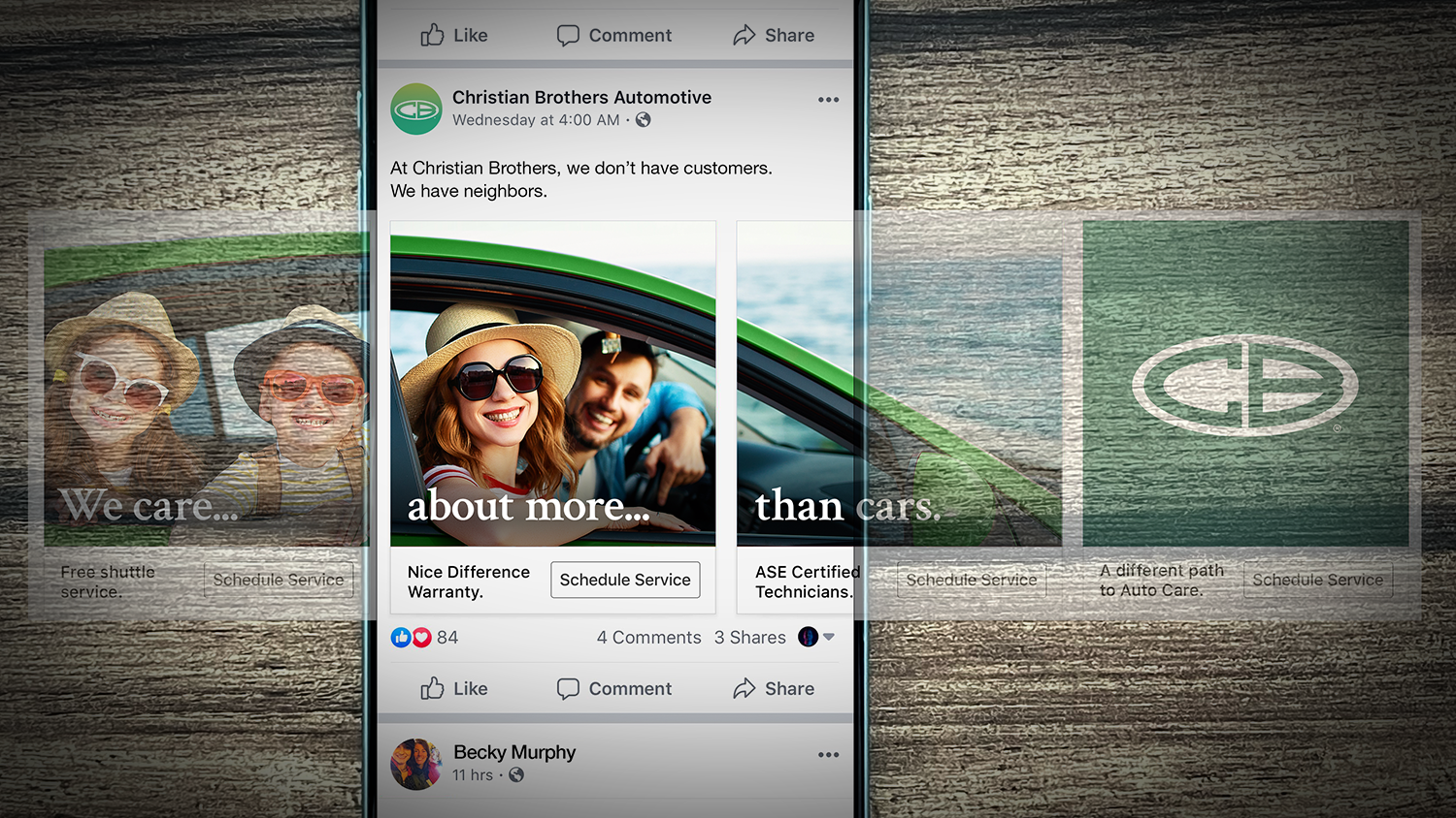 This is work I did for Christian Brothers Automotive. In the project I art directed visual design of the application. I also designed various assets for the application and campaign. I created layouts for print ads and mailers. I also created and edited social media video ads.